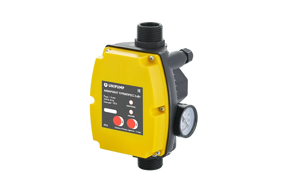 Блок управления насосом АКВАРОБОТ ТУРБИПРЕСС 1,5 предназначен для автоматического управления однофазными поверхностными и погружными насосами мощностью до 1,5 кВт Он автоматически включает и выключает насос в зависимости от потока жидкости и минимального давления (Pмин) в системе. Основные функции блока ТУРБИПРЕСС 1,5: