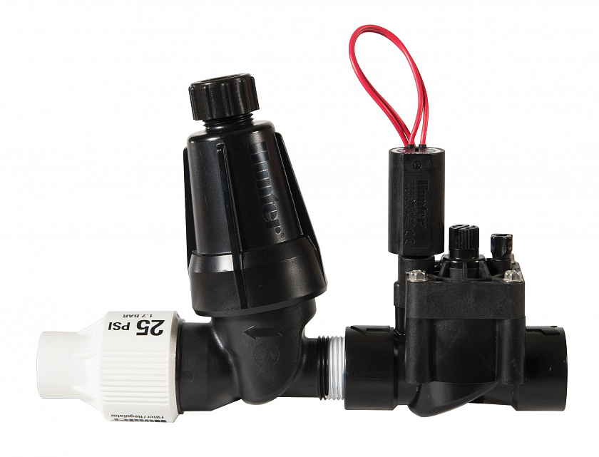 • Стартовый пусковой комплект HUNTER PCZ-101-25-B. Клапан PGV-101-GB плюс фильтр с регуляцией давления HFR-075-25.