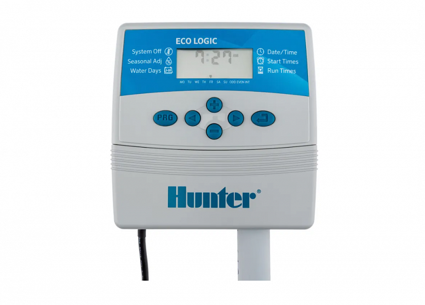 Hunter ELC-401i-E = 4-станционный фиксированный контроллер полива серии ECO-LOGIC; корпус: пластмассовый для помещений; гарантия: 2 года.