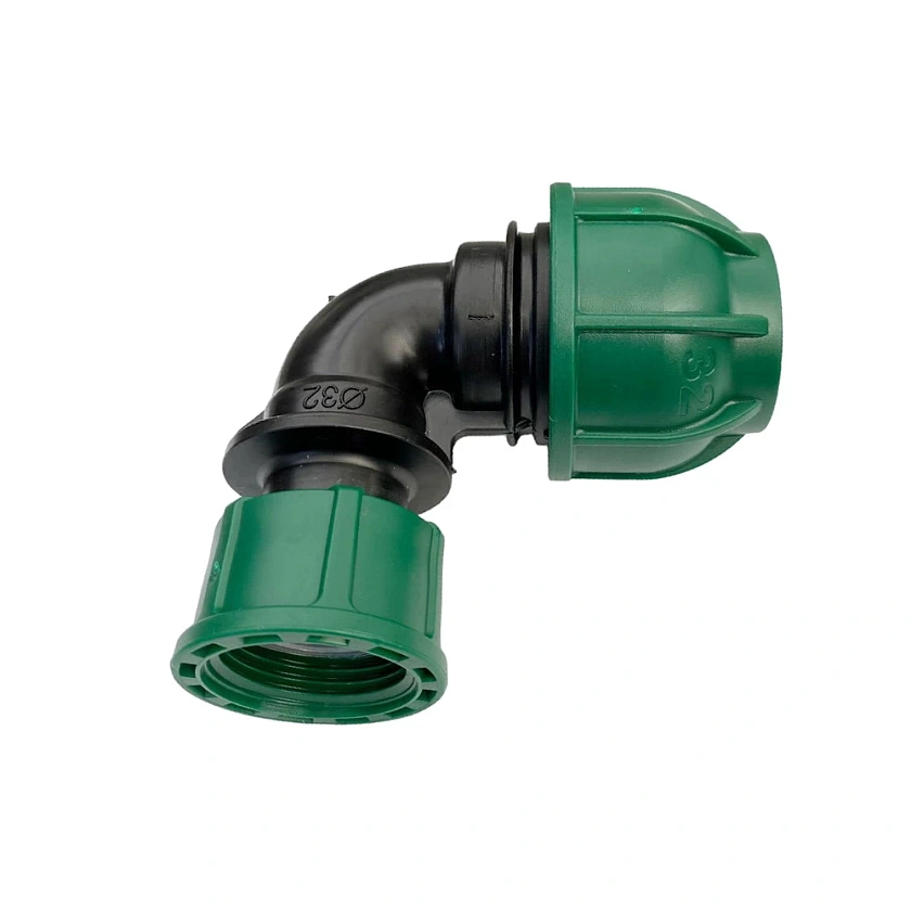 Отвод компрессионный 32×1″ с накидной гайкой обеспечивает легкое, быстрое и надежное подключение элементов системы водоснабжения и полива с наружной резьбой к полиэтиленовой трубе 32мм.